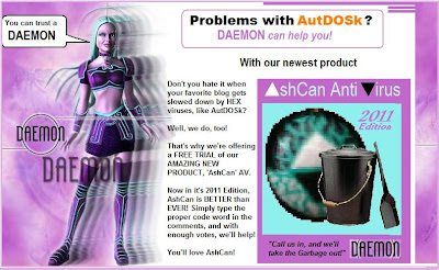 See what I did there? Like it? Yeah? Yeah I figured you would. BUT ANYWAYS! After I installed AshCan Anti-Virus 2011 I had no more AutDOSk problems (so HAHA AUTUMN, I WIN!). Well I have already found my code word, so go find yours SOMEWHERE ELSE.